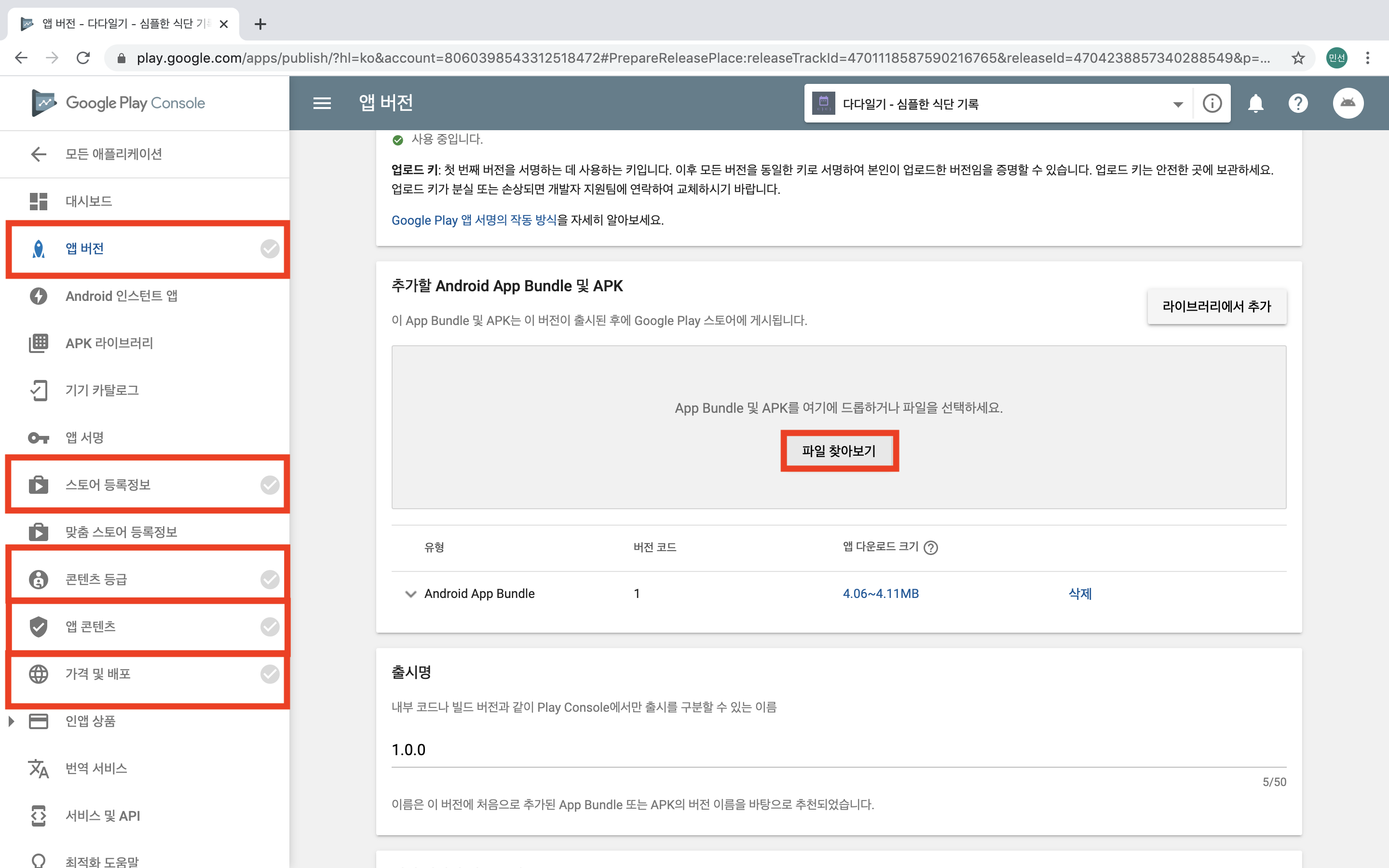 앱 버전에서 추가할 Android App Bundle 및 APK의 파일 찾아보기를 누르고 아까 만든 app-release.aab 파일을 선택합니다.