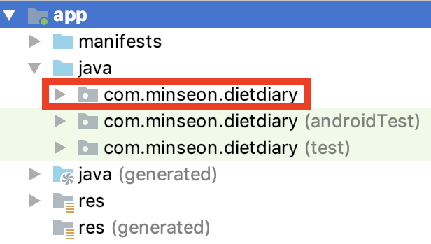 안드로이드 프로젝트를 처음 만들 때 패키지 명을 수정하지 않았다면 "com.example.앱이름"으로 되어있습니다.