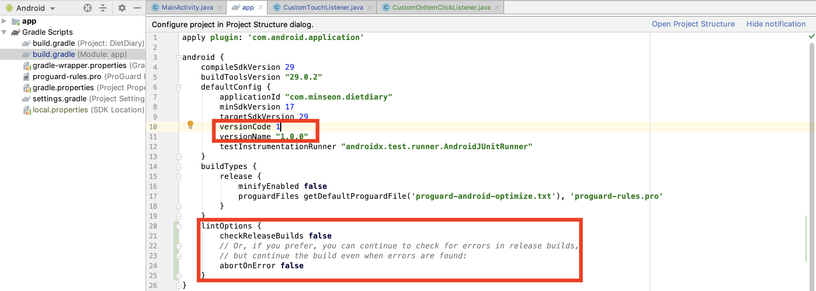 첫 출시이니 versionCode과 versionName은 맨 처음에는 1과 "1.0"으로 되어있을텐데, 저는 수정할 게 많을 것 같아서 versionName만 "1.0.0"으로 변경했습니다.