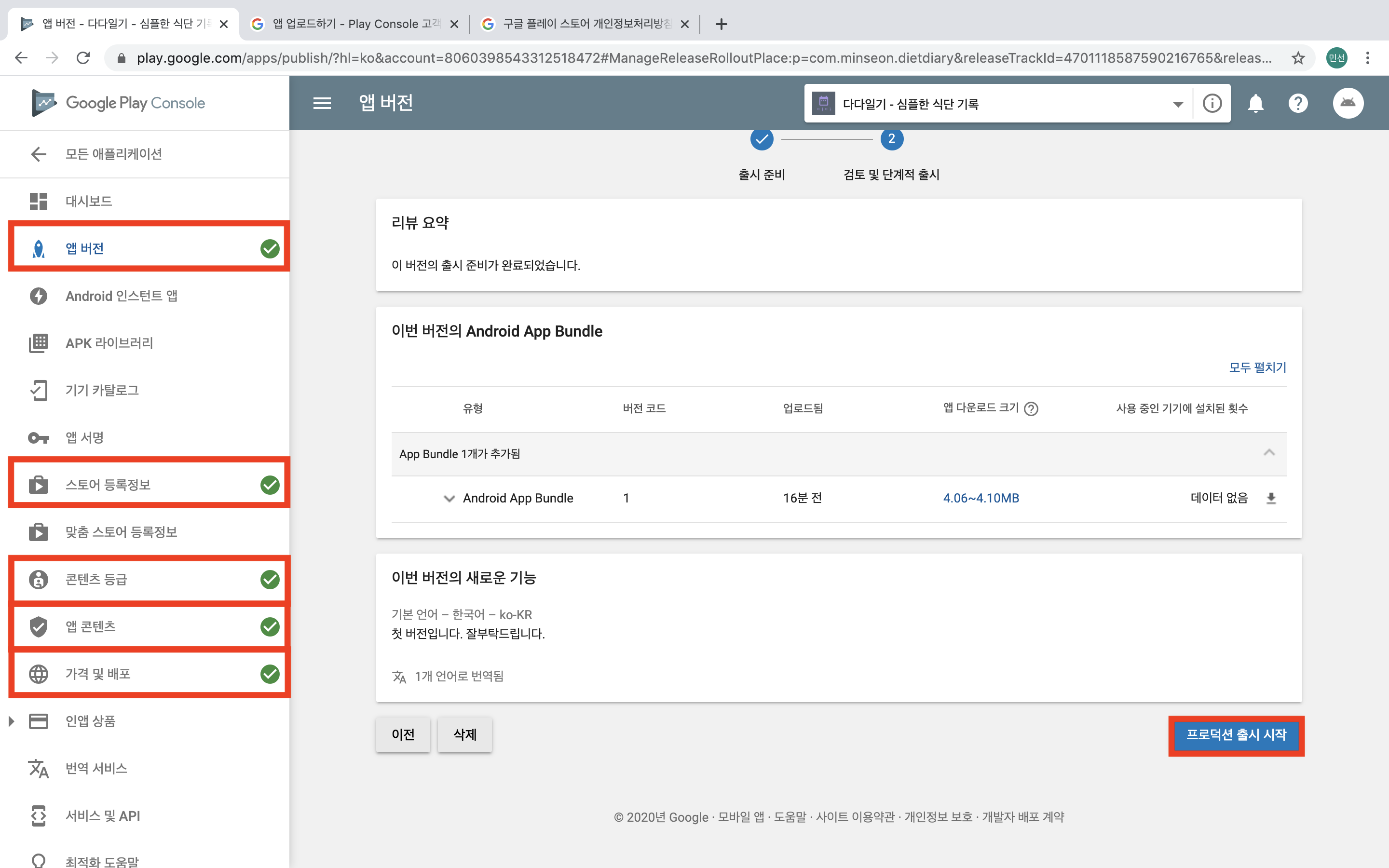프로덕션 출시하기를 누르면 앱이 출시....가 바로 되지는 않고 게시보류 상태로 올라갑니다.