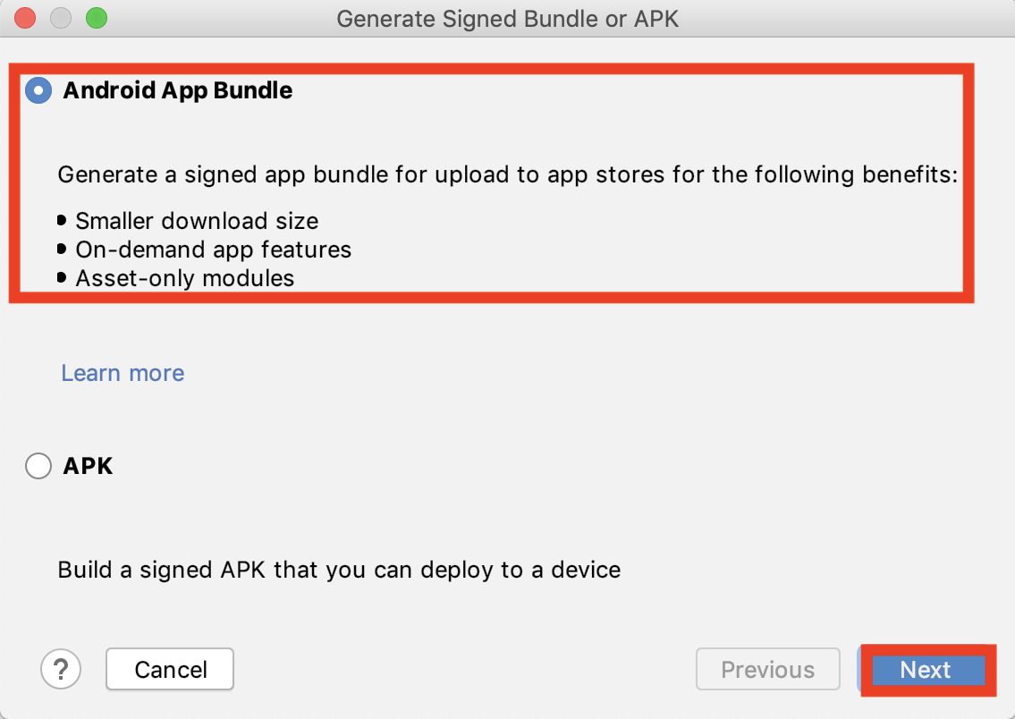 Android App Bundle을 선택하고 Next를 클릭합니다.