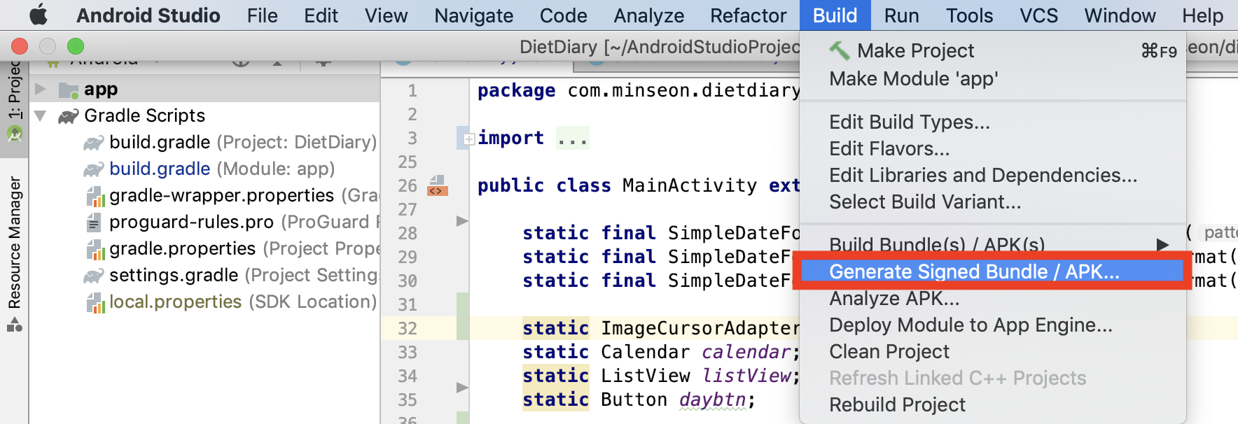 Build>Generate Signed Bundle/APK를 클릭합니다.