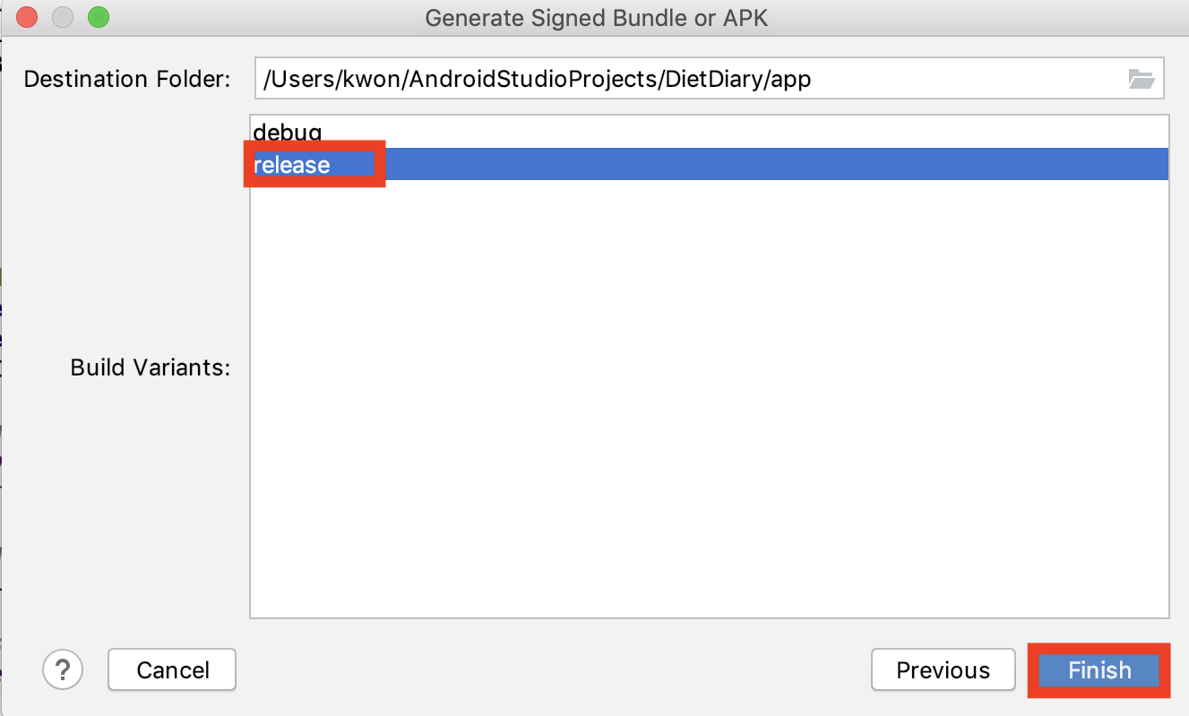 release를 선택하고 finish를 누릅니다.